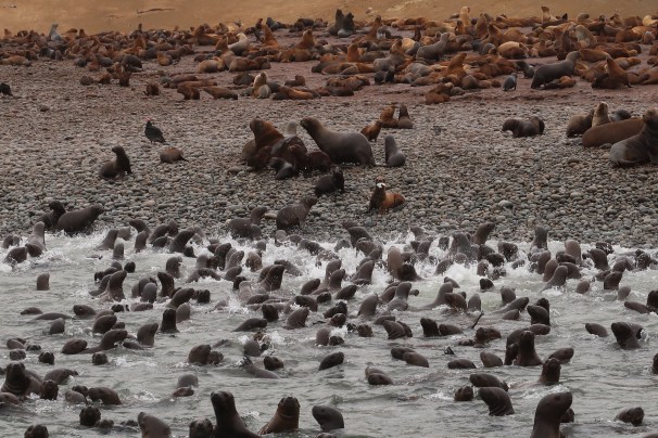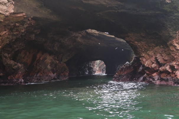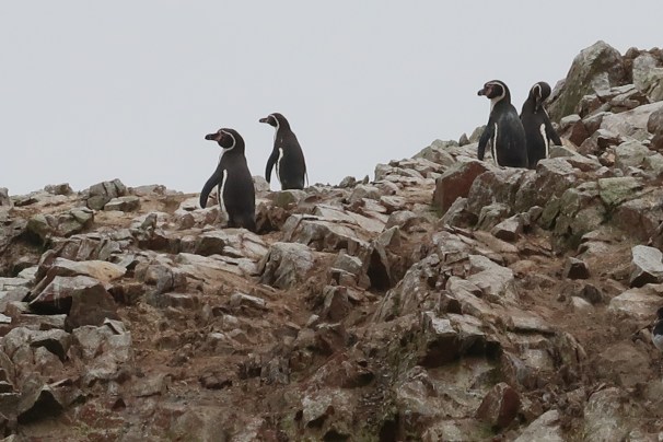 I did get to go on the cruise the next day to the Ballestas Islands, which would have been my preference if I had had to choose between the two.   The islands have been described as a mini-Galapagos due to the abundance of wildlife.  We saw mostly birds, lots of birds.  The islands are covered with birds and subsequently, that extremely valuable commodity, guano (commercial bird poop).  The Peruvians take great care of the islands as a result.  They’re protected by law; the guano is harvested from each one in rotation so each island is only disturbed every five years or so.  That way, the birds don’t leave in a huff, never to return, taking their poop with them.  Our guide was calling out names too fast for me to catch them all, but we saw pelicans (them I recognized), black terns, lots of Peruvian boobies (it wasn’t until I looked at my pictures that I realized almost of all of them were in pairs), Humboldt penguins, and a pair of red-legged cormorants, whose status is near-threatened.  There were only a few sea lions on the Ballestas Islands, but the captain of our little boat took us to another place where we saw hundreds.