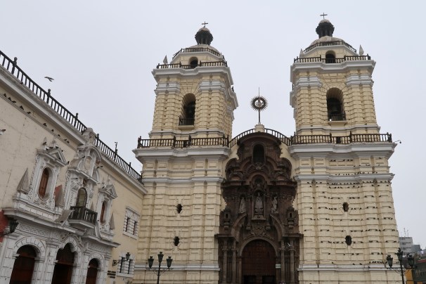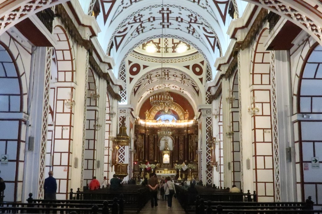 The museum at the Convent of San Francisco in Lima also boasts some beautiful textiles, silver, gold and jewels in the form of vestments, monstrances and other valuable gifts to the church.  Giving a really good gift could get you into the high rent district (under the altar) in the catacombs beneath the church when you died, which may have been why they were excavated so enthusiastically that the first building collapsed and they had to rebuild.  As it turned out, all that money only bought you a 10-year rental, at which time you were dumped in a huge pit with the bones of the rabble in order to make room for somebody else.  When you tour the catacombs now, the bones have been sorted and stacked into neat formations by people with too much time on their hands.  The museum is also known for its painting of the Last Supper, which shows Jesus and the disciples feasting on potatoes, chili peppers and (what do they always have at a big feast?) roast guinea pig.  We weren’t allowed to take pictures in the museum but you can look it up online if you’re interested.