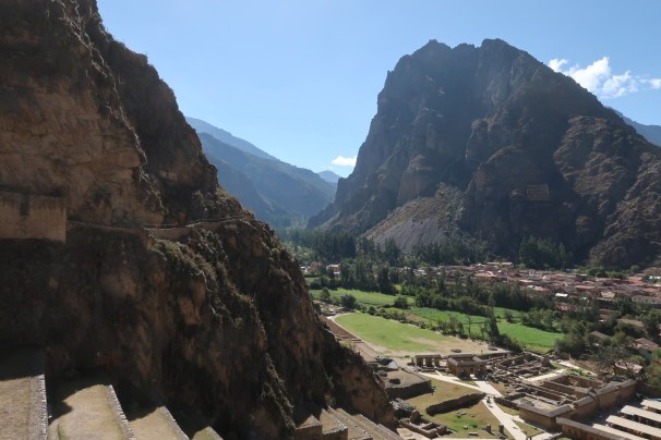 Instead of the Inca Trail, we took a nice, comfortable train and got there in an hour and a half.  Machu Picchu was a priority and the Inca Trail simply wasn’t.  From the train window, we could see hikers across the Urubamba River starting the trail and they appeared to be doing fine—the first day is mostly flat and easy, we were told.  They lull you into a sense of security before Day 2, when you hike to almost 14,000 feet.  The trail starts near the village where we boarded the train, Ollantaytambo (a tambo is an inn or resting place), having first visited an Incan fortress there.  There are Incan ruins scattered throughout the area known as the Sacred Valley, and when I say “ruins” I use the term loosely because the Inca people built with stone and they built to last.  Much of what survived destruction by the Spanish has lasted hundreds of years in almost perfect condition, withstanding earthquakes as well as the elements.  The fortress above Ollantaytambo is particularly well preserved.  The Incas tended to build their fortresses on mountainsides because their only weapon was the slingshot, and being above their enemy let them use it to great advantage.