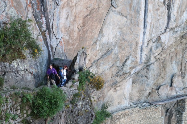 The morning after our guided tour, PJ and I went back to Machu Picchu in time for sunrise, more or less.  This time, we were on our own and we did one of several hikes that you can take in the area.  The most popular is to climb up the trail overlooking the ruins to the top of the mountain, which is actually the end of the Inca Trail for those hiking in.  We had intended to do this but almost by accident we chose the Inca Bridge trail instead.  It’s an easier trail that takes you part of the way around the mountain, and a lot of it is in the shade, in the morning at least.  Since it was a warm day and Machu Picchu is pretty high altitude and oxygen is thus a premium commodity, I wasn’t sorry we took the easier trail.  The trail ends at a narrow Incan drawbridge which they aren’t crazy enough to let anybody actually walk on.