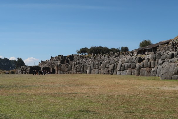 Although the Spanish conquistadors looted all the gold in short order, they fortunately didn’t completely destroy the temple when they built over it and not surprisingly, the Incan stonework has lasted unscathed through the centuries and several earthquakes.  (The same can’t be said of the convent, by the way, which had to be rebuilt after the earthquake of 1650.  Score one for the Incas.)  The Incan floors and some of the original walls remain as well as some artifacts.  The Cusco Cathedral is also magnificent—almost over the top–and like the Convent of San Francisco in Lima, it has a painting of the Last Supper with Jesus and the apostles feasting on guinea pig.  It also was built on a sacred Incan site by the Spanish, who were determined to replace any remnants of the Incan religion with symbols of Catholicism.  They used some of the boulders from Sacsayhuaman for construction of the cathedral.  Sacsayhuaman (if you say “sexy woman” in sort of a leering voice, you’re pretty close to the pronunciation) is on a plain overlooking Cusco.  It’s built of huge (and I mean BIG) stones and is believed to have been a kind of amphitheater for ceremonies and celebrations.