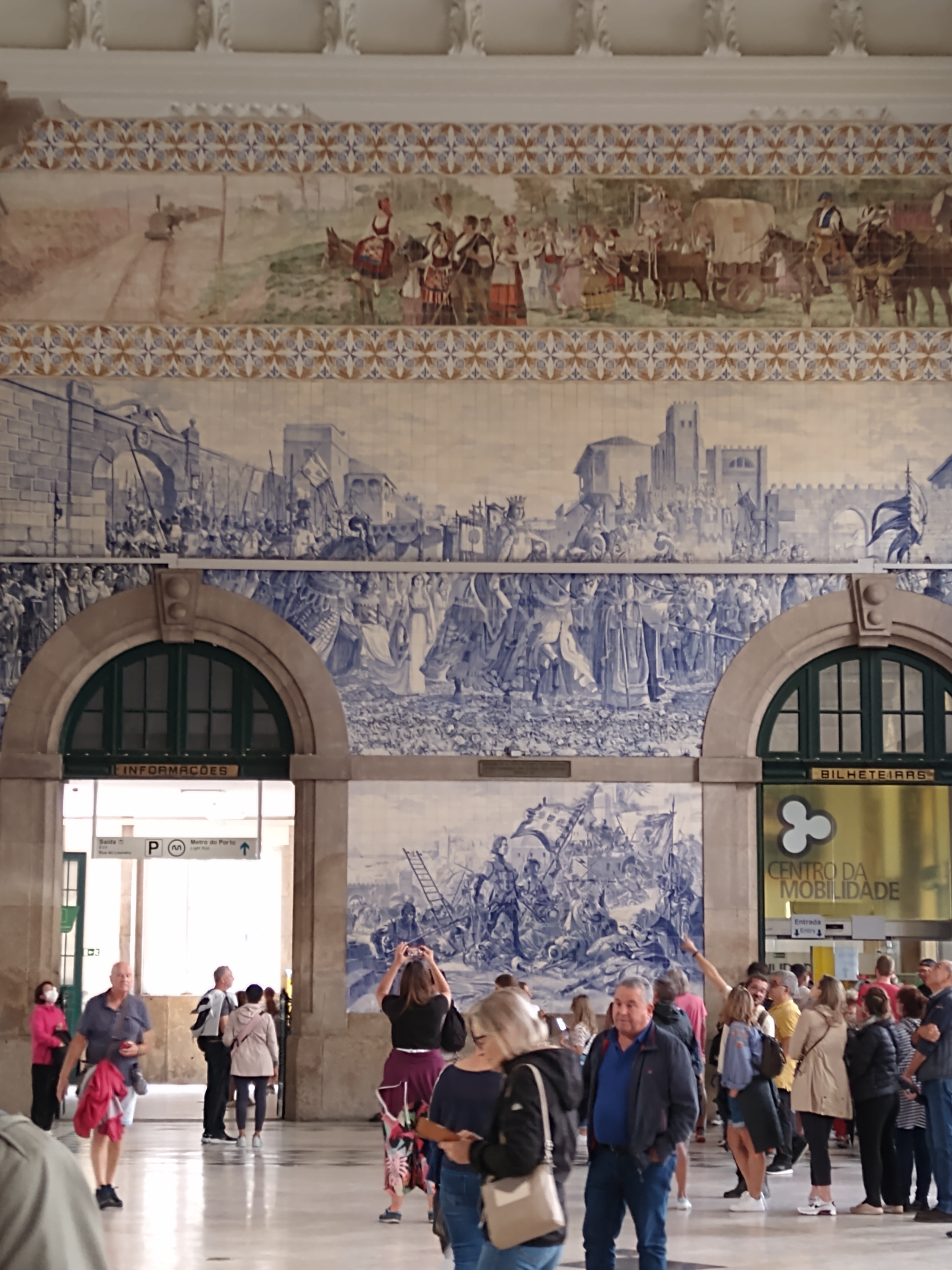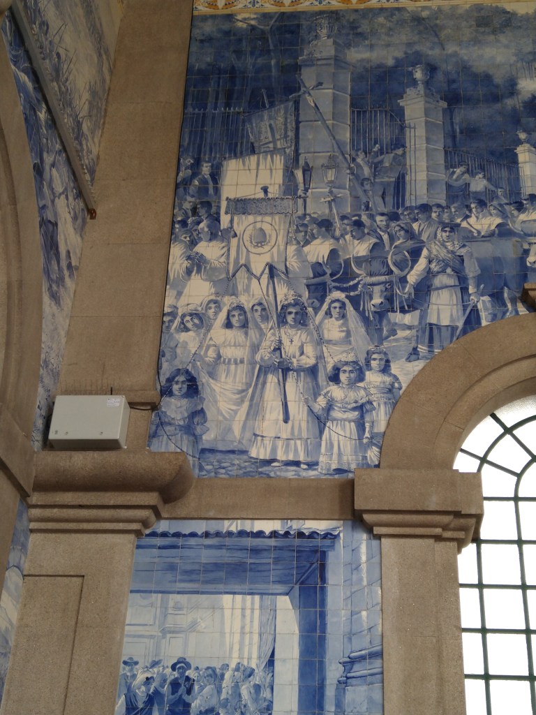 Tiles also figure prominently in the décor at Sao Bento train station, which happens to be just down the hill from the cathedral. It’s been described as one of the most beautiful train stations in the world, and I won’t argue. It was formerly a convent, but by the late 18th century, it was living on borrowed time due to an order by an earlier prime minister abolishing Catholic religious orders. The government wanted a train station in the area and announced that they would take over the convent and turn it into a train station as soon as the last nun died. Nobody expected that to take 19 years, apparently, and there’s a rumor that they may have helped the process along. Sao Bento is said to be haunted by the spirit of the last nun (a gentle haunting, not a scary haunting). The building was in a state of disrepair and required considerable renovation. Our guide, Nuno, told us that the man in charge was a talented artist who also happened to be “a lazy playboy”—his words, not mine. He didn’t take time to properly supervise the renovation and would give his underlings insufficient instructions so that, in some cases, tiles were put in places that, in context, really didn’t make a lot of sense. He pointed out one example where three little girls have the heads of adult men.