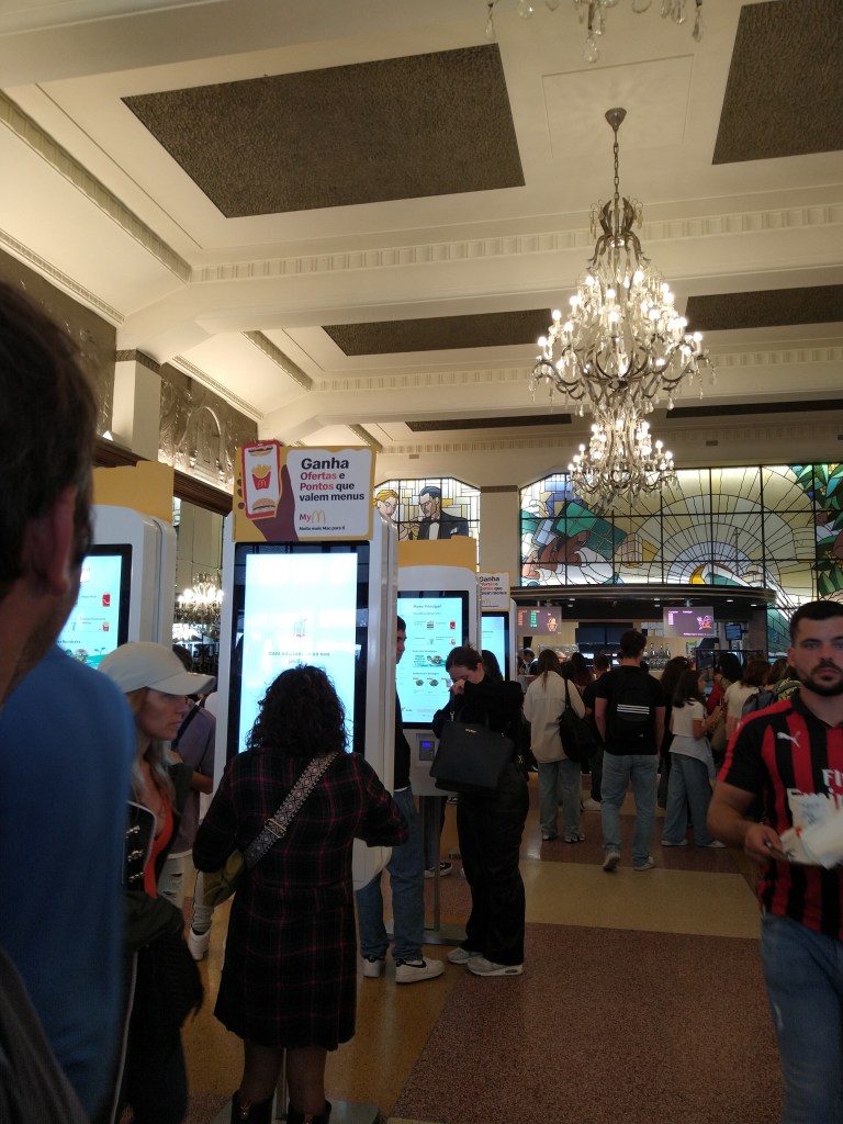 Another surprisingly beautiful building is McDonald’s, which Nuno took us to just so we could see the inside. I don’t recall that I’ve ever seen a McDonald’s with chandeliers and stained glass, and I know I’ve never seen one with somebody standing outside with a hawk to keep the pigeons away. There were some pigeons gathered just down the street, talking among themselves and looking surly, but they didn’t dare come closer.