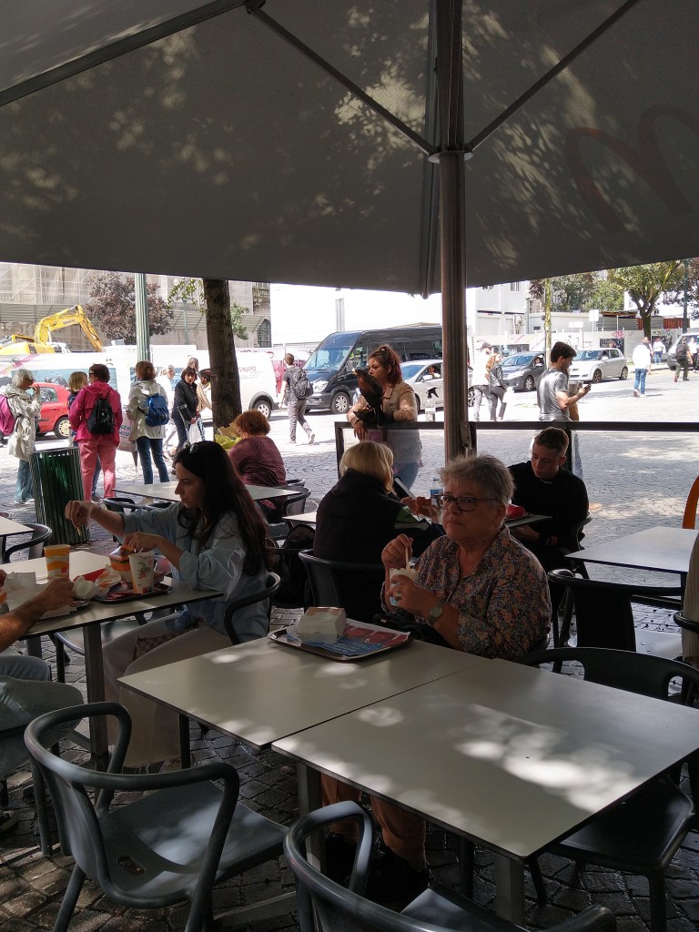 But I digress. On our first full day in Porto, I woke up at noon (six AM CDT, but it still shocked me to sleep so late) and, unsurprisingly, PJ wasn’t interested at all in getting up. I decided to stretch my legs by walking to one of the tourist offices and picking up a map of the city, and then stopping on the way back to pick up lunch. It was supposed to be a 10-minute walk to the tourist office, according to my GPS. What I didn’t know at the time is that Porto, for reasons both known and unknown, chews up GPS systems and spits them back out at the feet of unsuspecting tourists. The known reason is that there’s a ton of construction going on in the city at the moment for an expansion of the metro system, and the GPS would regularly try to send us in a direction that simply wasn’t possible due to a sidewalk or road closure. As to reasons unknown, well, that’s a good question. Since we were staying in the historical center, it was an area crowded with tourists, and all I know is, I have never in my life seen so many people holding their phones in front of them, looking first down at their phones and then up and around, searchingly, with expressions ranging from bewildered to slightly desperate. My little trip that should have taken 45 minutes max took over two hours.  I finally made it to the tourist office, knowing even as I got there that I had gone by a rather circuitous route, but that was nothing compared to the return trip. I set off with a little more confidence, seeing immediately where I had taken a wrong turn on the way there and rectifying the error. I retraced my steps fairly successfully and stopped at one of the cities’ bakeries on the Rua das flores (Street of flowers) for sandwiches and codfish cakes, which came in two cardboard boxes. There was no bag to put them in. About that time, I realized that it had started to rain. I put on the rain jacket I had brought with me, wrapped it around the boxes and balanced my phone on top. The situation went downhill from there. (The situation, not the walk itself—it went uphill and downhill, as the hills are pretty relentless in the historical center.) I started walking again, trying to keep the lunch dry and doing my best to follow the GPS directions. The GPS would tell me that I was 200 meters away, and to take a right turn, and I would take a right turn, and it would tell me I was now 450 meters away. Added to everything else, I was getting really hot, because it was really too warm for a jacket and hood. Things improved a little bit when I bought a 5-euro umbrella from an enterprising souvenir shop that had somebody standing outside with a whole rack of them. The young man even opened it for me while I was digging out the money. When I realized that the GPS had sent me to the Rua das flores for the fourth time, I was not happy, but I finally made it back to the hotel and while the cardboard boxes with our lunch looked kind of rough, the contents were, miraculously, still dry. And, as I predicted to myself on that first day, by our last day in Porto, we were getting to know that part of the city pretty well.
