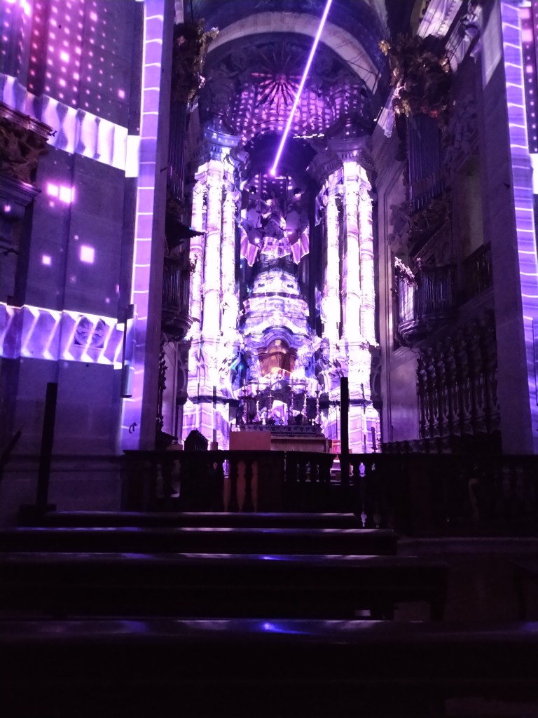 For our first meal in Portugal, PJ and I had pizza. No doubt some people would be horrified by that, but I’m not apologizing for it. We had arrived at our hotel in Porto—technically a rental apartment—at about five PM—three flights and some 24 hours after we left our home in Birmingham. We dropped off our stuff and then walked around the neighborhood for about an hour, but we were very tired and really just wanted to get something to eat and go back to the hotel, take a shower and crash with a book before going to sleep at an unfashionably early hour. We started looking for a restaurant, but although plenty of people were sitting outside at sidewalk cafes, none of them seemed to be eating. They all had glasses of wine/beer/other. People tend to eat late in Portugal, and most restaurants don’t open for dinner until 7 o’clock at the very earliest. We decided to ask at an Italian restaurant if we could get something to eat, and they said we could get pizza, and we said pizza would be just fine. We were staying in the historic district, and we didn’t realize at the time that we were a stone’s throw from the Clerigos (Clerics) Church and Tower, one of the iconic landmarks of the city.  Later in the week, we climbed the tower and attended a multimedia show in the church called “Spiritus.” It was inspired by the poem “After all, the best way to travel is to feel,” by Alvaro de Campos, and is truly spectacular. The entire church is filled with light and music. Still later in our stay, on one of our last days in Porto, we were walking back to our hotel when we were treated to music from the tower itself—a sort of fantasia on “Ode to Joy” while the tower bells rang.